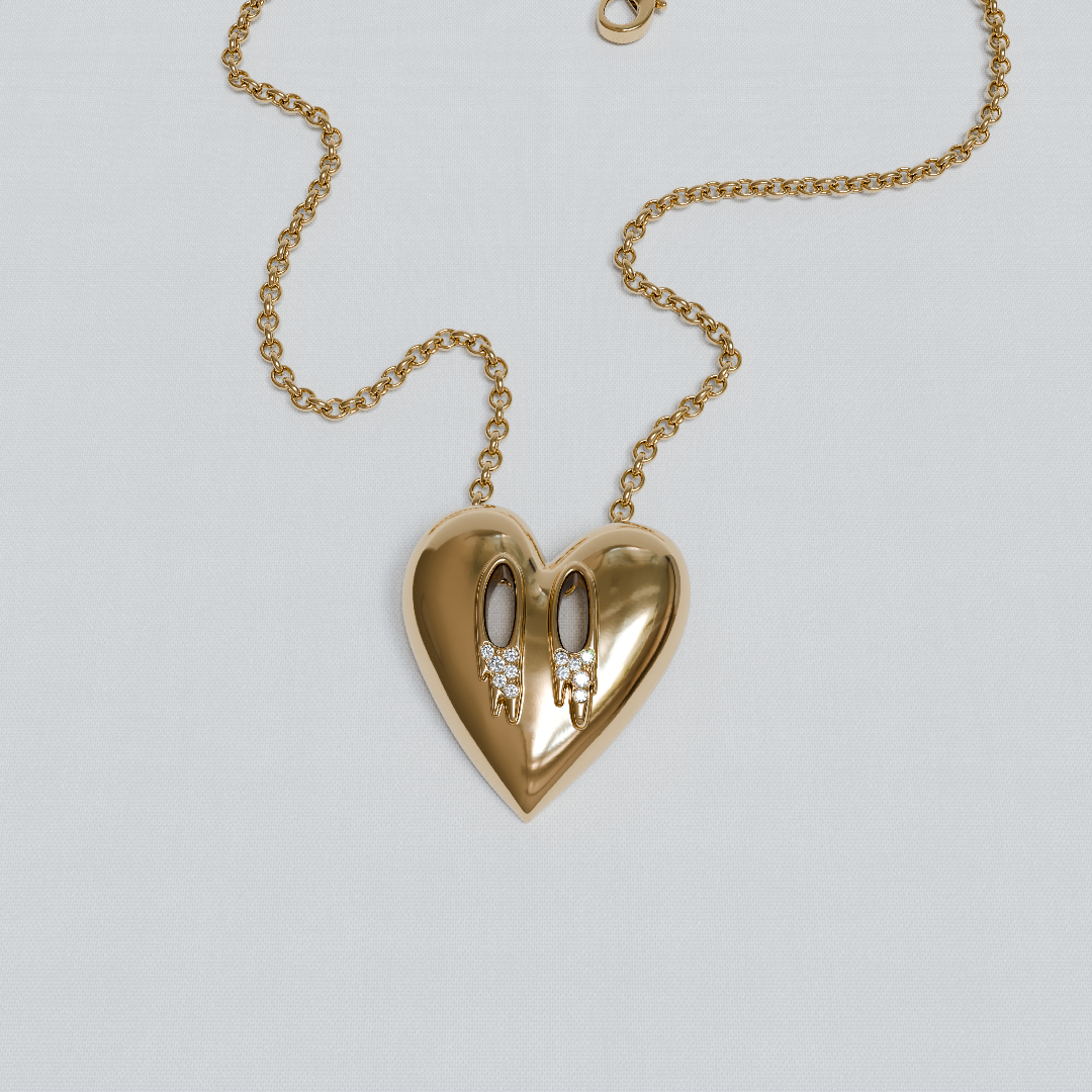 L'idée était de matérialiser ces paroles en une image forte : un cœur qui pleure. On a voulu figer ce moment de tristesse pour en faire une pièce esthétique, où chaque larme est sertie de cristaux brillants. C’est la retranscription visuelle de ce morceau, transformant une émotion chantée en un objet que l’on peut porter.